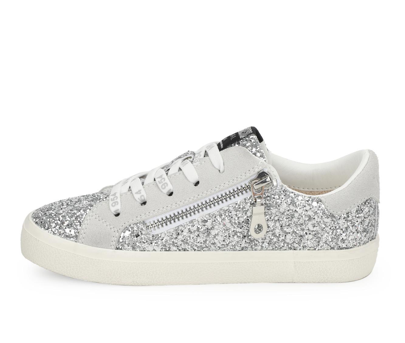 - Synthetic leather upper featuring glitter coating or metallic accents, varies by color